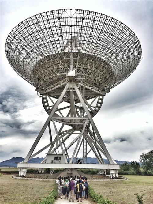 下午,伴随着大家雀跃不已的心情,同学们前往群山环绕的密云区不老屯。密云观测基地是中国科学院国家天文台天文观测与研究的重要基地之一。天公作美,我们在夏日难得的凉爽微风中抵达了美丽的密云观测基地。远远地,同学们就为气势宏伟仿若擎天巨人的50米天线惊叹不已。探月工程必须使用大功率的射电望远镜才能进行测控,50米天线是为完成绕月探测工程任务和射电天文观测而建设的,它担负起探月工程地面接收系统的重任!该站还建有30米FAST(世界最大单天线“500米口径球面射电望远镜”)的实验模型。